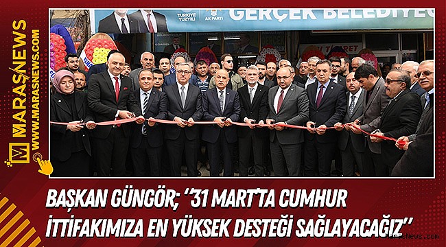 AK Parti Andırın, Dulkadiroğlu ve Onikişubat seçim ofislerinin açılışına katılan Başkan Hayrettin Güngör, 'Bugün açılışını gerçekleştirdiğimiz Cumhur İttifakı Seçim Ofislerimizin hayırlı ve uğurlu olmasını diliyorum. İnşallah 31 Mart'ta Kahramanmaraş'ımızda Cumhur İttifakımıza en yüksek desteği sağlayacağız' dedi.