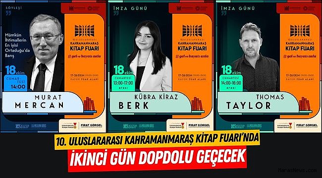 Söyleşilerin yanı sıra, birbirinden değerli isimler 18 Ekim Cumartesi günü imza günü programlarında da kitapseverlerle buluşacak. Rukiye İdeli, Fatma Şamata ve Kübra Kiraz Berk, 13.00 – 17.00 saatleri arasında Alfa Yayınları standında okurlar için kitaplarını imzalayacak. İngiliz çocuk kitabı yazarı Thomas Taylor, Timaş Yayınları standında, Yavuz Ali Bilge ise Damla Yayınları’nda düzenlenecek imza günü programlarında hayranlarıyla bir araya gelecek. Büyükşehir Belediyesinden yapılan açıklamada, 10. Uluslararası Kahramanmaraş Kitap Fuarı’nın ikinci gününde gerçekleştirilecek tüm programlara tüm vatandaşların davetli olduğu belirtildi.