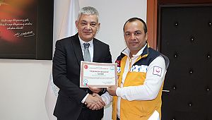 arkadaşlarının da yerine İl Sağlık Müdürünün elinden Teşekkür Belgelerini alan 112