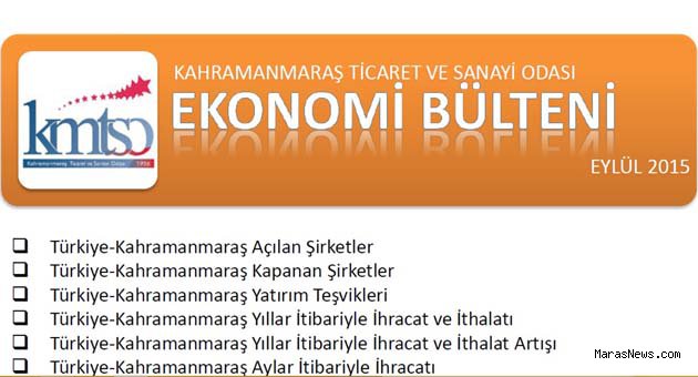 Kahramanmaraş Ticaret ve Sanayi Odası Eylül 2015 Ekonomi Bülteni’ni yayınladı. Bültende, Türkiye Odalar ve Borsalar Birliği Ticaret Sicili Gazetesi’nden alınan veriler paylaşıldı.