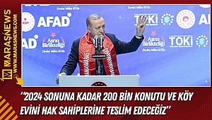 "Bunlara ilave olarak Kahramanmaraş'ta 20 bin konutumuzun yapımı hızla sürüyor. Şehrimizde konut, iş yeri ve ahır olarak hak sahibi yaklaşık 78 bin vatandaşımızın tamamına da anahtarlarını teslim edene kadar gece gündüz durmayacağız. Yarın Şanlıurfa'da, perşembe günü Adıyaman'da kura çekimi ve anahtar teslim törenleriyle inşası biten konutları vatandaşlarımıza veriyoruz. Amacımız yıl sonuna kadar 200 bin konutu ve köy evini hak sahiplerine teslim etmektir. Ardından bu sayıyı süratle 390 bine tamamlayacağız. Allah'ın izniyle kimseye mahcup olmadan, herkesin gönül hoşluğunu sağlayarak ve hoşnut ederek bu süreci çok geciktirmeden nihayete erdireceğiz."