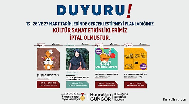 Kahramanmaraş Büyükşehir Belediyesi, Mart Kültür Sanat Etkinlikleri kapsamında 13 Mart Pazar günü düzenlenmesi planlanan ‘İhtiyar Kedi Garfi’ adlı çocuk oyunu, 26 Mart Cumartesi günü Yazar Saliha Erdim söyleşisi, 27 Mart Pazar günü ‘Benim Güzel Pabuçlarım’ adlı çocuk tiyatrosu ve ‘Bir Evlenme Teklifi – Ayı’ adlı yetişkin tiyatrosunun ileri bir tarihe ertelendiğini duyurdu. Kültür Spor ve Turizm Dairesi Başkanlığı’ndan yapılan açıklamada, “Mart Kültür Sanat etkinlikleri kapsamında kültür sanat dostlarıyla buluşturmayı planladığımız dört etkinliğimiz çeşitli nedenlerden dolayı ileri bir tarihe ertelenmiştir. Kültür Sanat Etkinlikleri kapsamında gerçekleştirilecek olan diğer programlarımıza tüm vatandaşlarımız davetlidir” ifadelerine yer verildi.