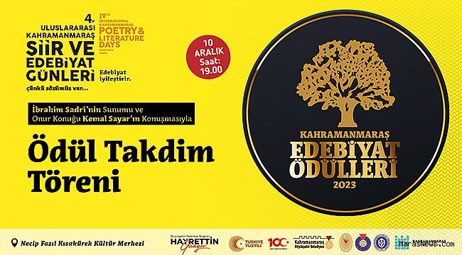 Kahramanmaraş Büyükşehir Belediyesinin ‘Edebiyat İyileştirir’ mottosuyla bu yıl 4’üncüsünü düzenlediği ve açıldığı günden itibaren binlerce edebiyatseveri ağırlayan Uluslararası Şiir ve Edebiyat Günleri, 10 Aralık Pazar günü gerçekleştirilecek programlarla noktalanacak. Uluslararası etkinliğin son gününde, Necip Fazıl Kısakürek Kültür Merkezi’nde Yazar Necip Tosun, İbrahim Demirci ve Bestami Yazgan’ın katılımıyla ‘Edebiyatın İyileştirici Gücü’ konulu panel düzenlenecek. Oturum Başkanlığını Şair – Yazar Mustafa Köneçoğlu’nun yapacağı program saat 13.00’da başlayacak. Saat 19.00’da ise 4. Uluslararası Kahramanmaraş Edebiyat Ödülleri Takdim Töreni gerçekleştirilecek. Sunuculuğunu İbrahim Sadri’nin yapacağı ve Yazar Prof. Dr. Kemal Sayar’ın onur konuğu olarak yer alacağı programda, çeşitli dallarda edebiyat ödülleri sahiplerini bulacak. Büyükşehir Belediyesinden yapılan açıklamada, 10 Aralık Pazar günü Necip Fazıl Kısakürek Kültür Merkezi’nde gerçekleştirilecek panel ve edebiyat ödülleri takdim törenine tüm edebiyatseverlerin davetli olduğu belirtildi.