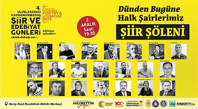 Kültür sanat etkinliklerine derinlik kazandırmak, bireylerin sanatsal gelişimlerine katkıda bulunmak ve entelektüel düzeyi artırmak için kültür sanat faaliyetlerini kesintisiz sürdüren Kahramanmaraş Büyükşehir Belediyesinin bu yıl 4’üncüsünü düzenleyeceği Uluslararası Şiir ve Edebiyat Günleri, 2 Aralık Cumartesi günü Necip Fazıl Kısakürek Kültür Merkezi’nde gerçekleştirilecek programla başlayacak. Saat 19.00’da başlayacak açılış programında Şair – Yazar Ramazan Avcı, ‘Dünden Bugüne Kahramanmaraşlı Halk Şairlerimiz’ konulu konferansta edebiyatseverlere seslenecek. Devamında; Ahmet Karakaya, Eshabil Karademir, Ayşe Karataş, Ali İhsan Öksüz, Fuat Bostancı, Muzaffer Aslan ve daha birçok halk şairinin katılımıyla şiir şöleni gerçekleştirilecek. Büyükşehir Belediyesinden yapılan açıklamada; 2 Aralık Cumartesi günü saat 19.00’da gerçekleştirilecek açılış programına tüm edebiyatseverlerin davetli olduğu ve 10 Aralık Pazar gününe kadar devam edecek 4. Uluslararası Kahramanmaraş Şiir ve Edebiyat Günleri etkinlik takvimine https://kahramanmaras.bel.tr/duyuru/2023/11/29/4-uluslararasi-kahramanmaras-siir-ve-edebiyat-gunleri internet adresinden ulaşılabileceği belirtildi.