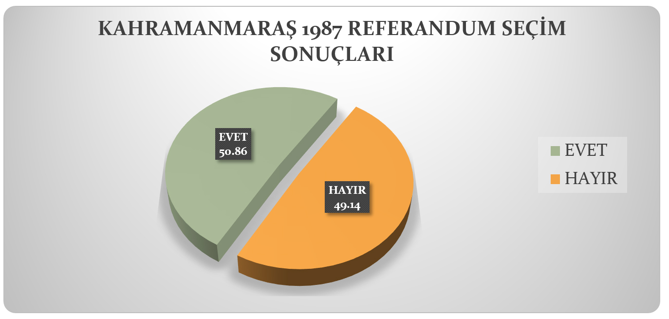6 Eylül 1987 yılında 12 Eylül öncesi parti liderlerinin siyasi yasaklarının kaldırılması için gidilen referandum da Türkiye genelinde ‘evet’ oyları ‘hayır’ oylarını kıl payı geçti. Türkiye ortalaması ‘evet’ yüzde 50.23, ‘hayır’ yüzde 49.77 olmuştu. Kahramanmaraş 1987 yılında gittiği referandumda Türkiye ortalamasına yakın bir oy kullandı. ‘evet’ oy oranı yüzde 50.86 olurken, ‘hayır’ oranı ise yüzde 49.14’te kaldı. Seçmenin yüzde 5.9’u ise sandığa gitmedi.