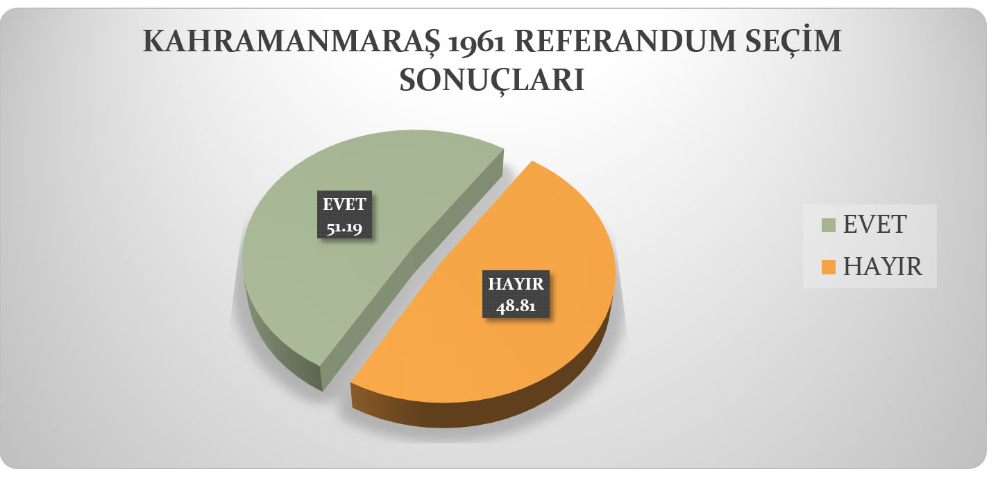 Türkiye’de ilk referandum 27 Mayıs 1961 darbesinin ardından yapıldı. Darbeci yönetim tarafından 9 Temmuz 1961’de iki meclisli parlamentonun getirilmesini sağlayan referandumda Türkiye ortalaması yüzde 61.7 iken Kahramanmaraş yüzde 51.19 ile ‘evet’ oyu kullandı. Referanduma katılanların yüzde 48.81’i ise ‘hayır’ oyu kullandı. Toplam oy sayısının yüzde 27.89’u ise sandığa gitmedi.