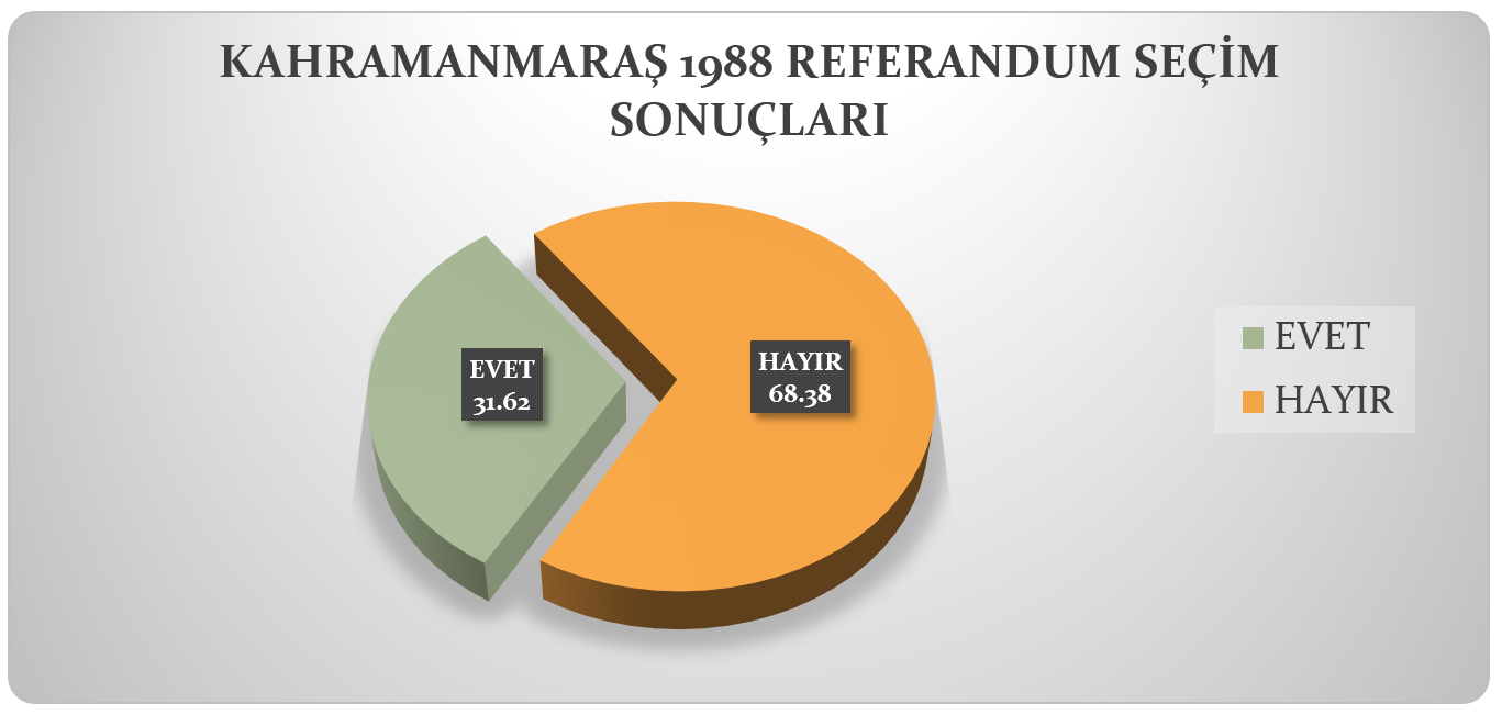 Türkiye 1988’de bir kez daha referandumda oy kullanmak için sandığa gitti. 25 Eylül 1988 yılında yerel seçimlerin 1 yıl öne alınıp alınmaması yönünde halka soruldu. Yüzde 65 hayır çıkarken ‘evet’ oranı yüzde 35’te kaldı. Kahramanmaraş ise Türkiye geneline uydu, yüzde 31.62 ile ‘evet’ yüzde 68.38 ile ‘hayır’ oyu kullandı. Seçimlerin 1 yıl öne alınmasına ilişkin Anayasa değişikliği reddedilmiş oldu.