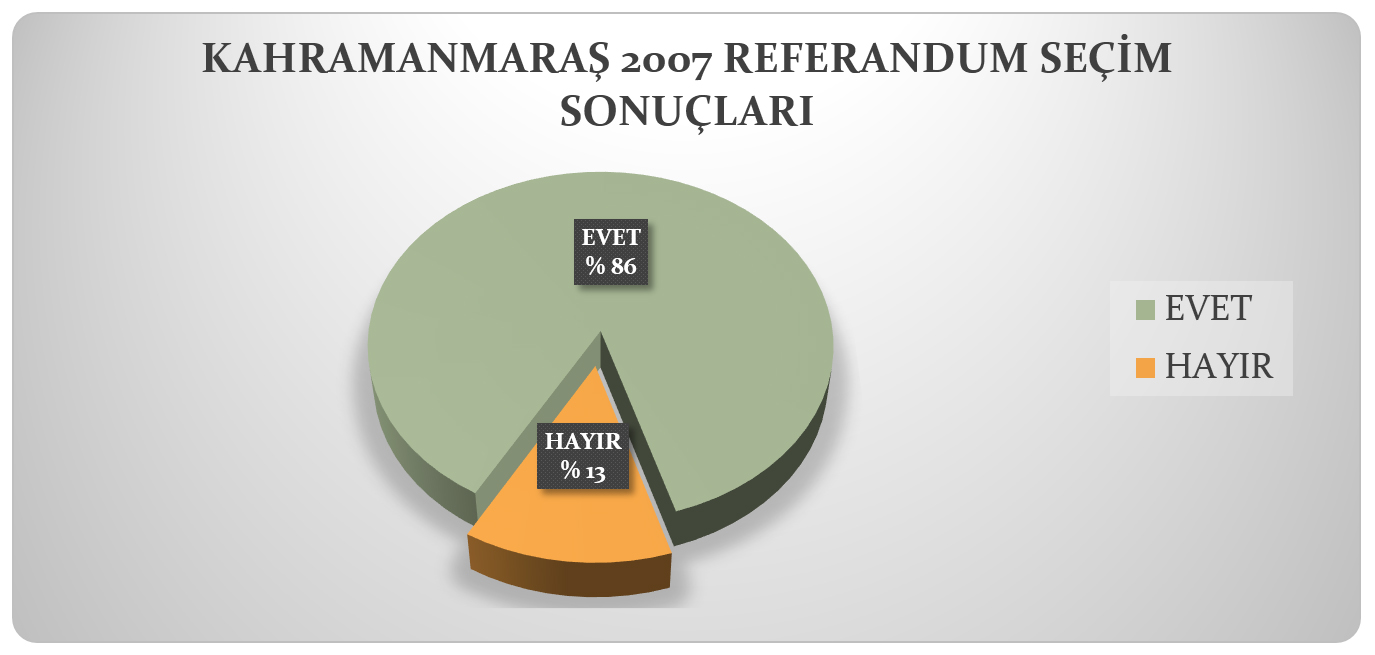 Ak Parti ile halk ilk kez 21 Ekim 2007’de referandumda oy kullanmak için sandık başına gitti. Abdullah Gül’ün Cumhurbaşkanlığı seçiminde dayatılan 367 kararının ardından Cumhurbaşkanının halk tarafından seçilip seçilmemesi yönünde yapılan referandumda, anayasa değişikliği yüzde 69 ile kabul edildi. Cumhurbaşkanının halk tarafından seçilmesine karşı çıkanların oranı ise 31’de kaldı. Böylece, cumhurbaşkanının halk tarafından seçilmesine ilişkin anayasa değişikliği kabul edildi. 2007’deki referandumda Kahramanmaraş yüzde 86 ‘evet’ oyu kullanarak Türkiye ortalamasının üzerinde yer aldı. ‘Hayır’ oyu verenlerin oranı ise yüzde 13’te kaldı. Kayıtlı seçmenin yüzde 30’u ise sandık başına gitmedi.