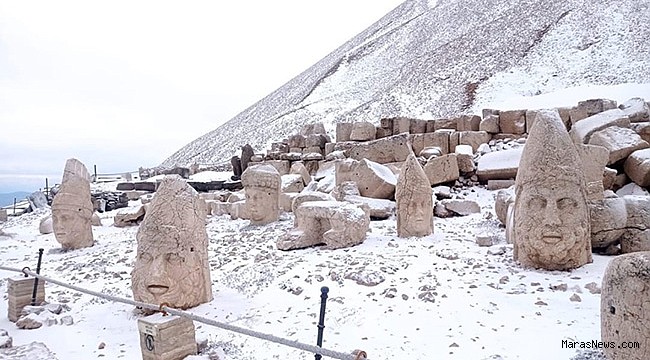 Güneşin doğuşunun ve batışının en güzel izlendiği yer olarak bilinen Adıyaman'daki 2206 metre rakımlı Kommagene Krallığı’na ait 50 metre yüksekliğinde, 150 metre çapındaki Tümülüs ve dev heykellerin bulunduğu, yerli ve yabancı turistlerin akınına uğrayan Nemrut Dağı’nda heykeller kısmen beyaza büründü.
