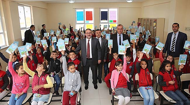 kitapları öğrencilere dağıtan Afşin Belediye Başkanı Mehmet Fatih Güven, çevre