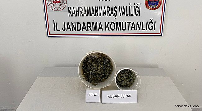 Alınan bilgilere göre, İlçeye bağlı Tanır Mahallesinde Ö.G’nin (37) uyuşturucu madde bulundurduğu bilgisi üzerine evinde arama yapıldı. İl Jandarma Komutanlığı KOM Şube Müdürlüğü ekipleriyle koordineli olarak şüphelinin evinde ve eklentilerinde yapılan aramada kova içerisinde 270 gram kubar esrar maddesi ele geçirildi. Ö.G sorgulanmak üzere karakola götürülürken, uyuşturucu maddelere el konuldu.