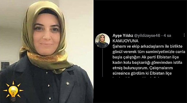 Ayşe Yıldız, yazılı açıklamasında; “Şahsım ve ekip arkadaşlarım ile birlikte gönül vererek tüm samimiyetimizle canla başla çalıştığım Ak parti Elbistan ilçe kadın kolu başkanlığı görevimden istifa etmiş bulunuyorum. Çalışmalarım süresince gördüm ki Elbistan ilçe başkanlığının asıl hedefinin memleket sevdası ak parti davası olmadığı, Sayın Cumhurbaşkanımız Recep Tayyip Erdoğan'ın bizlere telkin ettiği samimi ve dürüst çalışma aşkına uymadığı, makamlarını ve kendilerine tevdi edilen görevin layıkıyla yerine getirilmediği bir ortamda, arkadaşlarım ile birlikte verdiğim mücadeleden rahatsız olunduğu, bana ve ekibime uygulanan mobbing ve psikolojik baskının dayanılmaz olduğu noktada Kahramanmaraş il kadın kolu başkanlığının da verdiğimiz mücadelede bize destek olmadığı, sorunlara umursamaz yaklaşımı sonucunda ben ve yönetim kurulu üyelerimin istifaya mecbur bırakıldığımızı kamu oyuna üzülerek bildiririm. Şahsım olarak Sayın Cumhurbaşkanımızın ve partimin yanındayım. Saygılarımla” ifadelerine yer verdi.