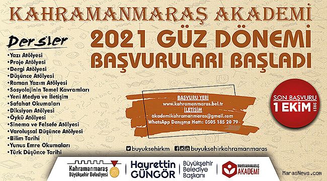 Kahramanmaraş Büyükşehir Belediyesi tarafından düzenlenen Kahramanmaraş Akademi’de güz dönemi başlıyor. Akademi eğitimleri kapsamında uzman eğitmenler tarafından toplamda 15 branşta ücretsiz eğitim verilecek. Yedi Güzel Adam Edebiyat Müzesi’nde verilecek eğitimler arasında; Yazı Atölyesi, Proje Atölyesi, Dergi Atölyesi, Düşünce Atölyesi, Roman Yazım Atölyesi, Sosyolojinin Temel Kavramları, Yeni Medya ve İletişim, Safahat Okumaları, Diksiyon Atölyesi, Öykü Atölyesi, Sinema ve Felsefe Atölyesi, Varoluşsal Düşünce Atölyesi, Bilim Tarihi, Yunus Emre Okumaları ve Türk Düşünce Tarihi branşları yer alıyor. Bugün itibariyle başlayan ve bir hafta boyunca devam edecek ön başvuruların son tarihi ise 1 Ekim Cuma günü olarak belirlendi. Eğitim başvuruları ise https://lk.tc/8eyEI adresindeki formun doldurulmasıyla çevrimiçi olarak alınıyor. Kültür Spor ve Turizm Dairesi Başkanlığı tarafından yapılan açıklamada, eğitimlere başvuracak adayların 0505 185 20 79 WhatsApp hattından kısa mesajla ya da [email protected] adresinden elektronik posta yoluyla detaylı bilgi alabileceği belirtildi.