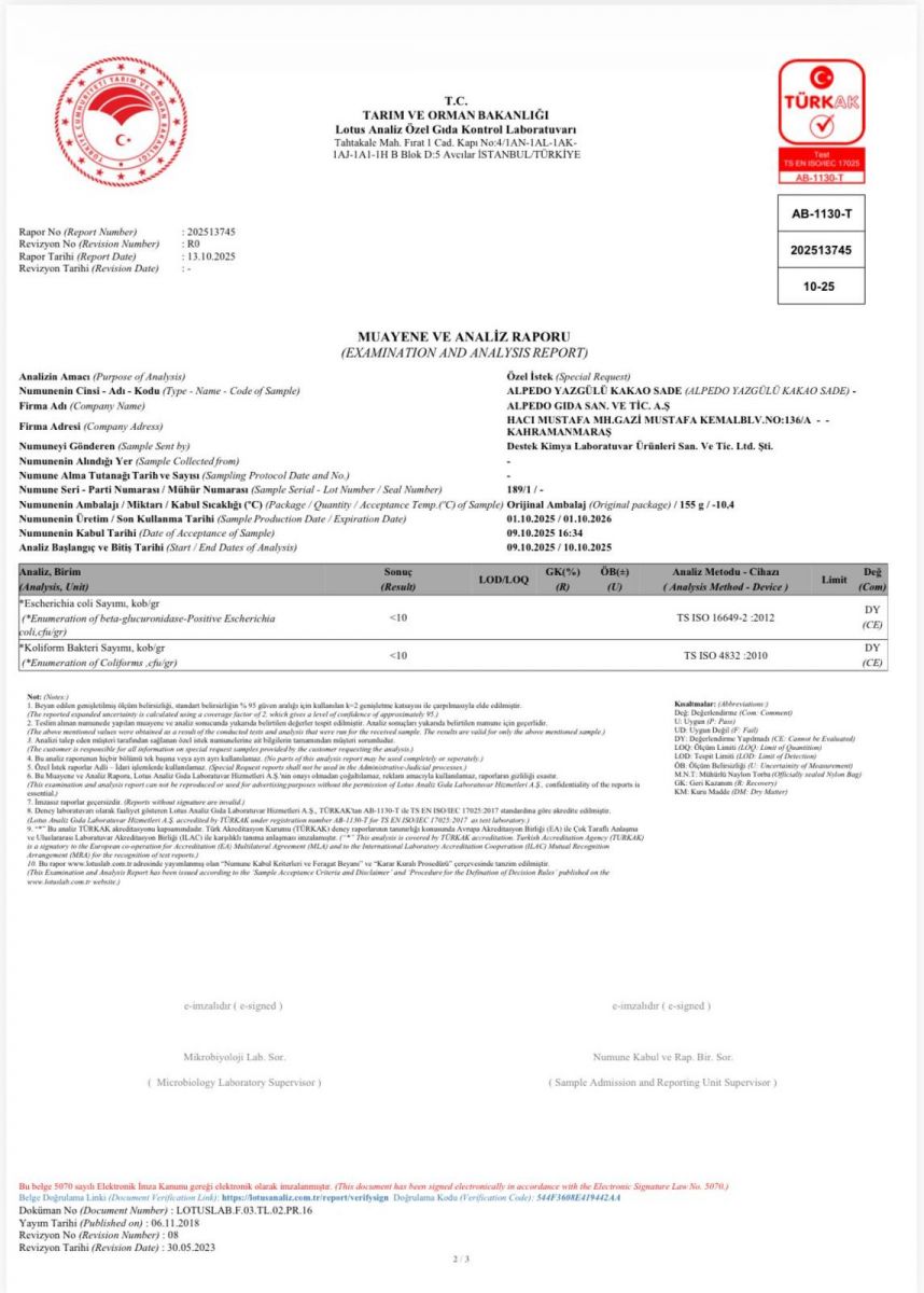 “Son günlerde bazı basın organlarında yer alan laboratuvar sonuçlarıyla ilgili iddialar tamamen asılsızdır. Bahsi geçen ürünler tamamen ihracat amacıyla üretilmiştir. Üretim sonrasında kendi laboratuvarımızda yapılan analizlerde sonuçlarımız uygundu. Ardından Kahramanmaraş Sütçü İmam Üniversitesi’ne (KSÜ) teyit amaçlı olarak numunelerimizi gönderdik. Ancak analiz sürecinde yaşanan gecikme ve numunelerin bekleme koşullarına bağlı olarak farklı sonuçlar çıkmıştır.”
