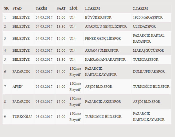 Yerel Amatör Ligde 4-5 Mart 2017 tarihlerinde oynanacak olan müsabakaların programı belirlendi. 2016-2017 Futbol Sezonu heyecanı Batıpark, Saim Çotur, Belediye ve Pazarcık, Elbistan, Afşin Futbol Sahasında oynanan U19, U17, U15, 14, U16 gurup maçlarıyla devam ederken Bu hafta u16 ve u19 maçlarına 1 hafta ara verilirken u14 ve 1. Amatör Küme Play-off maçları da bu hafta nefesleri kesecek. Ligi müsabakaları programı ve Türkiye Futbol Federasyonu (TFF) Kahramanmaraş İl Tertip Komitesi; TFF İl Temsilcisi Ali Kazancı’nın çağrısı üzerine bu kararda imzası bulunan üyelerin katılımı 27 Şubat 2017 günü saat 17:00’de Kahramanmaraş ASKF Mehmet Bağrıaçık Toplantı Salonu’nda Adem Karaköse, Ahmet Güler, İlker Yiyen, Abdurrahman Akbaba, Salih Fidan, Sami Çomruk, Ali Aytemiz ile birlikte şu karaları aldılar; 04-05 Mart 2017 tarihlerinde Batıpark ve Saim Çotur Stadlarında Türkiye Geneli Liselerarası Grup müsabakaları oynatılacağından dolayı U16 ve U19 Gruplarına 1 hafta ara verilmesine, 04-05-08 Mart 2017 tarihlerinde oynanacak olan müsabakaların aşağıdaki şekilde oynatılmasına karar verildi.
