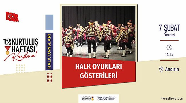 Milli mücadelenin 102. yıl dönümü kapsamında Büyükşehir Belediyesi tarafından düzenlenen Kurtuluş Haftası kutlama etkinlikleri hız kesmeden sürüyor. Konserden halk gösterilerine, söyleşiden spor müsabakalarına kadar pek çok alanda gerçekleştirilen etkinliklerle kurtuluşun 102. yıl dönümü kutlanmaya devam ediyor. Etkinlik takvimi kapsamında 7 Şubat Pazartesi günü (yarın) Andırın ilçesinde halk oyunları gösterileri ve konser düzenlenecek. Saat 14.15’te KKTC Halk Oyunları ekibi tarafından halk oyunları gösterileri sergilenecek. Halk oyunları gösterilerinin ardından saat 14.30’da ise sevilen sanatçı Uğur Işılak sahne alacak. Andırın’da gerçekleştirilecek etkinliklere tüm vatandaşlar davet edildi.