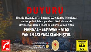 Yangınların önlenmesi amacıyla kent genelinde ormanlık alanlarda veya yakınlarında ateş yakılmamasına ilişkin alınan kararda süre uzatıldı. Kahramanmaraş Valiliği’nin 2021/5 sayılı kararı gereğince alınan tedbirler, Kahramanmaraş Büyükşehir Belediyesi’ne bağlı mesire ve piknik alanları dâhil tüm orman arazileri için geçerli olacak. 31 Ağustos Salı itibariyle uygulamaya giren karar kapsamında, 30 Eylül Perşembe tarihine kadar ormanlık bölgeler veya yakınlarında semaver ve mangal dâhil ateş yakılması yasaklandı. Yapılan açıklamada, vatandaşların alınan karara aykırı bir davranışla karşılaşmaları halinde 112 Acil Çağrı Merkezi’ne ya da 177 Alo Yangın İhbar Hattı’na çağrıda bulunabileceği belirtildi.