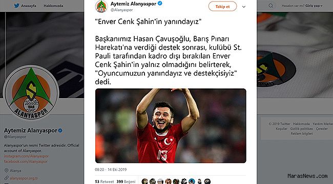 paylaşımda, Enver Cenk Şahin'in milli formalı fotoğrafına ve Alanyaspor Kulübü
