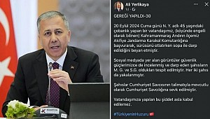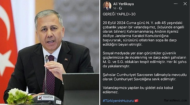 İçişleri Bakanı Ali Yerlikaya, sosyal ağ üzerinden yapmış olduğu paylaşımda; “20 Eylül 2024 Cuma günü N. Y. adlı 45 yaşındaki çobanlık yapan bir vatandaşımız, (köyünde engelli olarak bilinen) Kahramanmaraş Andırın ilçemiz Akifiye Jandarma Karakol Komutanlığına başvurarak, sürüsünü otlatırken sopa ile darp edildiğini beyan etmiştir. Sosyal medyada yer alan görüntüler güvenlik güçlerimizce de incelenmiş ve darp eden şahısların M. G. ve S.G. oldukları tespit edilmiştir. Her iki şahıs da yakalanmıştır. Şahıslar Cumhuriyet Savcısının talimatıyla mevcutlu olarak Cumhuriyet Savcılığına sevk edilmiştir. Vatandaşımıza yapılan bu şiddet asla kabul edilemez” ifadelerine yer verdi.