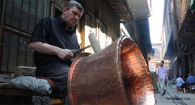 Kentin tanınan bakırcı ustası Mustafa Tepebaşı, yaptığı açıklamada, mesleğe 37 yıl önce babasının yanında başladığını söyledi.