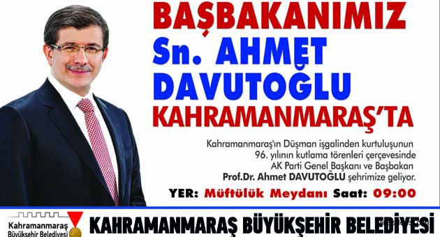 Hafız Ali Efendi Meydanı(Müftülük Meydanı)’nda gerçekleştirilecek olan 12 Şubat Kurtuluş Bayramı kutlama törenlerine katılacak olan AK Parti Genel Başkanı ve Başbakan Prof. Dr. Ahmet Davutoğlu, 12 Şubat 2016 Cuma günü saat 09.00’da Kahramanmaraşlılarla buluşarak kurtuluş sevincini beraber yaşayacak.