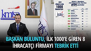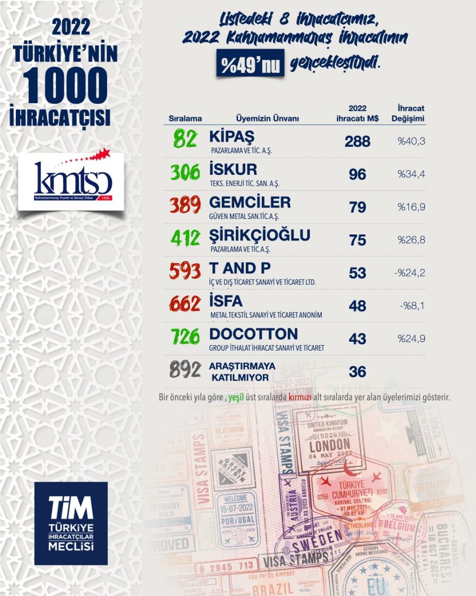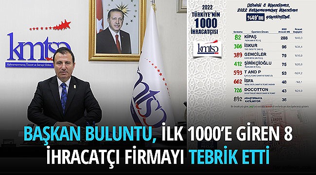 Türkiye İhracatçılar Meclisi (TİM) tarafından Türkiye’nin İlk bin İhracatçısı 2022 araştırması sonuçları kamuoyuyla paylaşıldı. Açıklanan listede Kahramanmaraş’tan 8 firma yer alırken, bu firmalar kent ihracatının yüzde 49’unu gerçekleştirdi. İlk bin listesine ilişkin açıklamalarda bulunan KMTSO Yönetim Kurulu Başkanı Mustafa Buluntu, “2022 verileri ile yapılan ve 25 sektörün değerlendirmeye alındığı Türkiye’nin İlk 1000 İhracatçı Araştırması’nda listeye girerek onur kaynağımız olan firmalarımızı kutluyor, başarılarının devamını diliyorum” şeklinde konuştu.