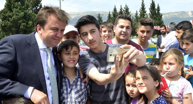 Büyükşehir Belediye Başkanı Fatih Mehmet Erkoç’u aralarında gören çocuklar fotoğraf çektirme yarışına girdiler.