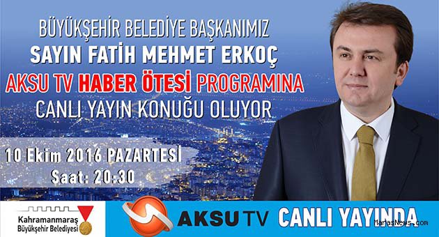 Aksu Tv’de Murat Eğridağ’ın sunumu ile yayınlanan Haber Ötesi Programına canlı yayın konuğu olarak katılacak olan Büyükşehir Belediye Başkanı Fatih Mehmet Erkoç, yapılan hizmetleri canlı yayında anlatacak.