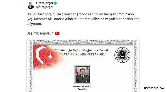 Kahramanmaraş Büyükşehir Belediye Başkanı Fırat Görgel, Pençe – Kilit operasyonu bölgesinde arama tarama faaliyeti sırasında bölücü terör örgütü mensupları ile sağlanan temasta şehit düşen Kahramanmaraşlı Mehmetçik Piyade Astsubay Çavuş Mehmet Ali Horoz için taziye mesajı yayımladı. Başkan Fırat Görgel mesajında, “Bölücü terör örgütü ile çıkan çatışmada şehit olan hemşehrimiz P. Asb. Çvş. Mehmet Ali Horoz’a Allah'tan rahmet, ailesine ve yakınlarına sabırlar diliyorum. Başımız sağ olsun” ifadelerine yer verdi.