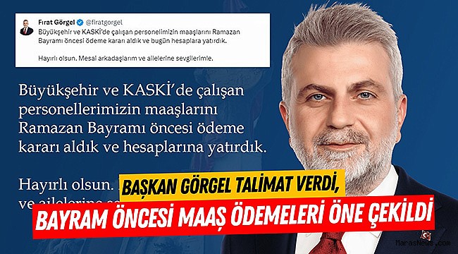 Göreve başladığı günden itibaren saha ziyaretleri, iftar buluşmaları, Ramazan Bayramı’nda ücretsiz toplu taşıma hizmeti ve tebrik çiçeği AFAD’a bağış olsun gibi faaliyetleriyle vatandaşların büyük teveccühünü kazanan Kahramanmaraş Büyükşehir Belediye Başkanı Fırat Görgel’den bir müjde de Büyükşehir Belediyesi ve KASKİ personellerine geldi. Başkan Fırat Görgel, 15 Nisan’da yapılacak maaş ödemelerinin Ramazan Bayramı dolayısıyla öne çekilerek 8 Nisan Pazartesi günü personellerin hesaplarına yatırıldığını belirtti. Büyükşehir Belediye Başkanı Fırat Görgel, sosyal medya hesabından yaptığı paylaşımda: “Büyükşehir ve KASKİ’de çalışan personelimizin maaşlarını Ramazan Bayramı öncesi ödeme kararı aldık ve bugün hesaplara yatırdık. Hayırlı olsun. Mesai arkadaşlarım ve ailelerine sevgilerimle” ifadelerine yer verdi. Başkan Görgel’in müjdeli haberi personeller tarafından da büyük bir mutlulukla karşılandı.