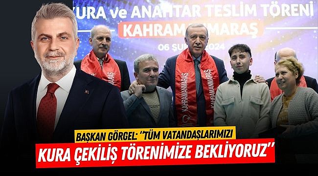 Kahramanmaraş Büyükşehir Belediye Başkanı Fırat Görgel, 30 Kasım Cumartesi günü Cumhurbaşkanı Recep Tayyip Erdoğan’ın teşrifleriyle gerçekleştirilecek kalıcı konutların kura çekim törenine tüm vatandaşları davet etti. Başkan Fırat Görgel açıklamalarında, “30 Kasım Cumartesi günü Cumhurbaşkanımız Sayın Recep Tayyip Erdoğan’ı şehrimizde ağırlayacağız. Tüm hemşehrilerimizi Cumartesi günü saat 13.30’da Şehirlerarası Otobüs Terminali arkasında bulunan Merkez Spor Kompleksi’nde gerçekleştirilecek kalıcı konutların kura çekim törenine davet ediyoruz” diye konuştu.