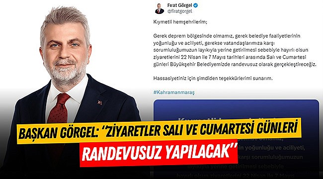 Kahramanmaraş Büyükşehir Belediye Başkanı Fırat Görgel, hayırlı olsun ziyaretinde bulunmak isteyen vatandaşlara yönelik sosyal medya hesabından bir çağrıda bulundu. Başkan Fırat Görgel paylaşımında: “Gerek deprem bölgesinde olmamız, gerek belediye faaliyetlerinin yoğunluğu ve aciliyeti, gerekse vatandaşlarımıza karşı sorumluluğumuzun layıkıyla yerine getirilmesi sebebiyle hayırlı olsun ziyaretlerini 22 Nisan ile 7 Mayıs tarihleri arasında Salı ve Cumartesi günleri Büyükşehir Belediyemizde randevusuz olarak gerçekleştireceğiz. Hassasiyetiniz için şimdiden teşekkürlerimi sunarım” ifadelerine yer verdi.