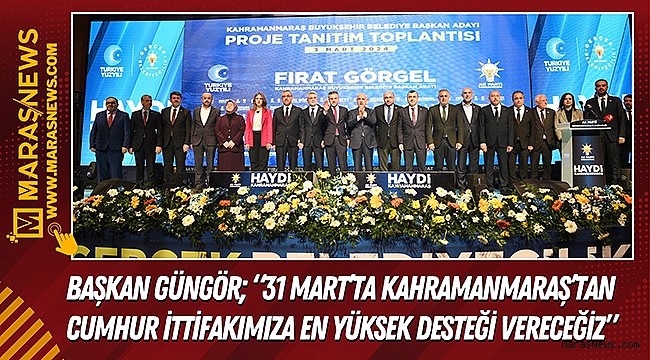 Kahramanmaraş Büyükşehir Belediye Başkanı Hayrettin Güngör, AK Parti Kahramanmaraş Büyükşehir Belediye Başkan Adayı Fırat Görgel’in proje tanıtım toplantısına katıldı. Mehmet Akif Ersoy Kültür Merkezi’nde gerçekleştirilen programda; AK Parti Genel Başkan Yardımcısı ve Teşkilat Başkanı Erkan Kandemir, TBMM Tarım, Orman ve Köyişleri Komisyonu Başkanı Prof. Dr. Vahit Kirişci, AK Parti Kahramanmaraş Milletvekilleri Ömer Oruç Bilal Debgici, Dr. Tuba Köksal, Mevlüt Kurt ve Prof. Dr. Mehmet Şahin, MHP Kahramanmaraş Milletvekili Doç. Dr. Zuhal Karakoç Dora, AK Parti İl Başkanı Cüneyt Doğan, MHP İl Başkanı Hüseyin Vahit Demiröz, ilçe belediye başkan adayları ve çok sayıda vatandaş da yer aldı.