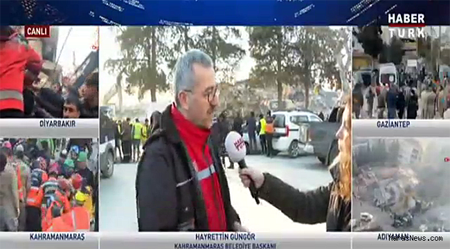 Kahramanmaraş Büyükşehir Belediye Başkanı Hayrettin Güngör, 6 Şubat Pazartesi günü merkez üssü Pazarcık ve Elbistan olan ve toplamda 10 ilde büyük yıkıma neden olan depreme ve bölgede devam eden çalışmalara ilişkin Habertürk canlı yayınında açıklamalarda bulundu. Gazeteci – Yazar Nagehan Alçı’nın sorularını yanıtlayan Başkan Hayrettin Güngör, “Çok büyük bir felaket yaşadık. Can kayıplarımız var. 6 Şubat Pazartesi günü meydana gelen her iki depremin merkez üssü de Kahramanmaraş. Uzmanların ifadesine göre karada meydana gelen en büyük deprem. Saat 04.17’de deprem meydana geldi ve bizler de saat 04.30’da 112 Merkezine geçtik ve çalışmaları koordine etmeye başladık” dedi.