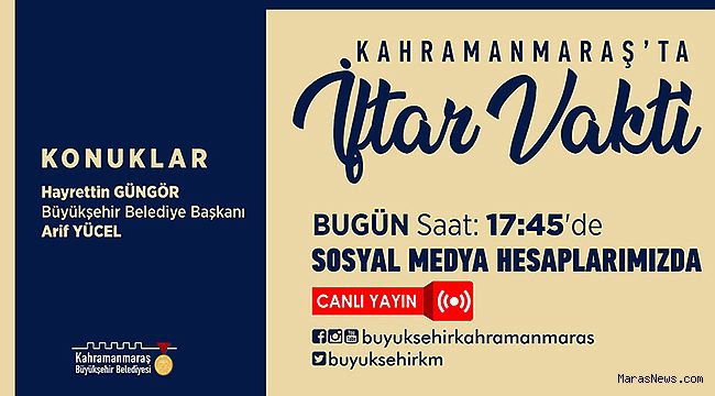 Kahramanmaraş Büyükşehir Belediyesi tarafından Ramazan ayı boyunca düzenlenecek olan "İftar Vakti" programları devam ediyor. Sunuculuğunu Mehmet Yaşar’ın yaptığı “İftar Vakti” programının 15 Nisan Perşembe (bugün) 17.45’te gerçekleştirilecek canlı yayınındaki konukları Büyükşehir Belediye Başkanı Hayrettin Güngör ile Hattat Arif Yücel olacak. Kahramanmaraş’ta ramazan ve Büyükşehir Belediyesi’nin ramazan ayındaki çalışmaları konuşulacak. ‘İftar Vakti’ programı ile ilgili olarak Kültür, Spor ve Turizm Dairesi Başkanlığı tarafından yapılan açıklamada, “Ramazan süresince devam edecek etkinliğimiz her gün 17.45’te Büyükşehir Belediyemizin sosyal medya hesaplarından canlı yayınlanmaktadır” ifadeleri kullanıldı.