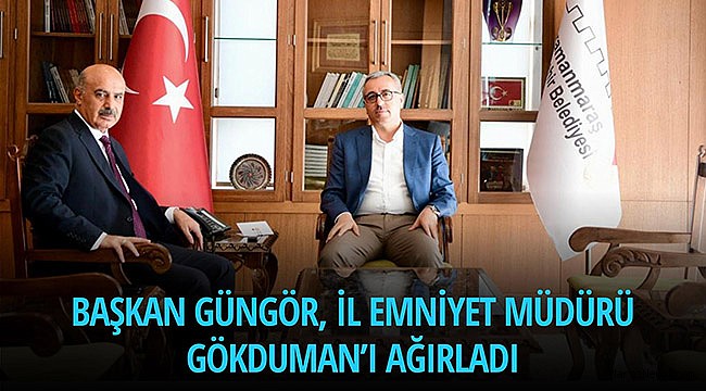 Kahramanmaraş Büyükşehir Belediye Başkanı Hayrettin Güngör, Cumhurbaşkanı Kararı ile Kahramanmaraş İl Emniyet Müdürü olarak atanan Nurettin Gökduman’ı misafir etti. Gökduman’a görevinde muvaffakiyetler dileyen Başkan Güngör, “Rize’den Kahramanmaraş’ımıza atanan İl Emniyet Müdürümüz Sayın Nurettin Gökduman misafirimiz oldu. Sayın Gökduman’a ziyaretleri için teşekkür ediyor, vazifelerinde muvaffakiyetler diliyorum. Kahramanmaraş’ımız için yüksek bir koordinasyonla çalışmayı sürdüreceğiz” ifadelerini kullandı.