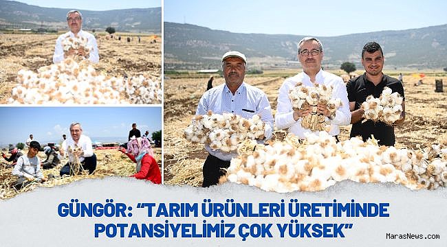 Kahramanmaraş Büyükşehir Belediye Başkanı Hayrettin Güngör, ‘Pazarcık Beşçeşme Sarımsak Festivali’ kapsamında düzenlenen hasat etkinliğine katıldı. Pazarcık Belediye Başkanı İbrahim Yılmazcan ve Büyükşehir Belediyesi Meclis Üyesi Hanifi Toptaş’ın da yer aldığı etkinlikte Başkan Hayrettin Güngör, sarımsak üreticileri ve işçilerle bir araya geldi. Etkinlikte yaptığı konuşmada Kahramanmaraş’ın sarımsak üretiminde çok önemli bir yere sahip olduğunu vurgulayan Başkan Hayrettin Güngör, “Dünyada tarım ürünü çeşitliliği açısından Kahramanmaraş çok ciddi bir potansiyele sahip. Kahraman şehrimiz coğrafyası, iklimi, birçok coğrafi bölgede toprağının olmasıyla çok fazla tarım ürününe ev sahipliği yapıyor. Fındık, sarımsak, pamuk, narenciye, kiraz, ceviz, elma gibi birbirinden farklı ürünlerin bir arada yetiştiği coğrafya sayısı çok azdır. Kahramanmaraş’ımız sarımsak üretiminde de Türkiye’de çok önemli bir yere sahip. Sarımsak üretiminde Türkiye’de üçüncü sırada yer alıyoruz. Geçtiğimiz yıl şehrimizde toplamda 50 bin tonun üzerinde sarımsak üretildi. İnşallah bu yıl daha fazla üretim olacağını ümit ediyorum” dedi.