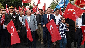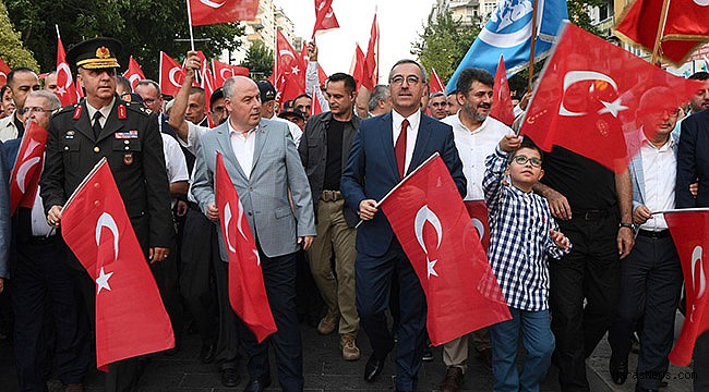 Demokrasi Meydanı’nda gerçekleştirilen programda konuşma yapan Vali Ömer Faruk Coşkun, “Tarih boyunca birçok kez istiklal ve istikbal mücadelesi veren aziz milletimiz, nice şanlı zaferler, nice kahramanlık destanları yazmıştır. Bu uğurda büyük bedeller ödeyen milletimiz hiçbir dönemde esaret altında yaşamamış, kutsal bildiği vatan topraklarını canı pahasına korumuştur. 15 Temmuz 2016 tarihinde FETÖ’nün alçak darbe girişimine karşı aziz milletimiz kadını erkeği, genci yaşlısıyla canını ortaya koymuş kendi iradesine ve özgürlüğüne yapılan hain saldırı karşısında dik bir duruş sergileyerek yeniden bir dirilişe imza atmıştır. 15 Temmuz darbe girişimi ile devletimizin varlığı, ülkemizin birlik ve bütünlüğü, milli egemenliği hedef alınmış buna karşın Cumhurbaşkanımız Sayın Recep Tayyip Erdoğan liderliğinde kahraman milletimizin kararlı duruşu ve onurlu direnişiyle bu hain teşebbüs bertaraf edilmiştir. Ay yıldızlı bayrağımızın gölgesi altında sonsuza kadar bağımsız yaşamaya and içmiş Türk Milleti, istiklali ve istikbali uğruna canını ortaya koymaktan hiçbir zaman çekinmeyecektir. İçten ve dıştan birlik ve beraberliğimizi bozmaya kalkışanlara karşı 15 Temmuz’da nasıl bir araya geldiysek bundan sonra da birlik ve beraberlik içerisinde bu milli duruşu ortaya koyacağız” dedi.