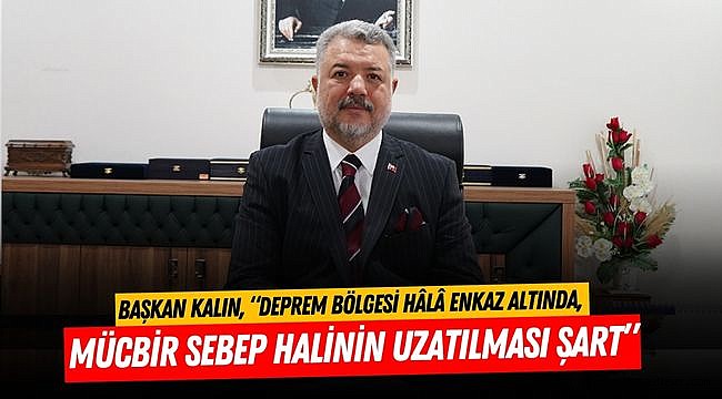 Başkan Kalın, yaptığı açıklamada, depremden en çok etkilenen şehirlerde hâlâ hayatın normale dönmediğine dikkat çekerek, şu ifadelere yer verdi, “Bizler hâlâ enkaz altındayız. Deprem bölgesi ve ilimizde mücbir sebep halinin uzatılmamasını, meslek mensuplarımız, serbest meslek erbapları, esnaf ve sanatkârlarımız, sanayi ve iş dünyamız asla kabullenemeyecektir.”