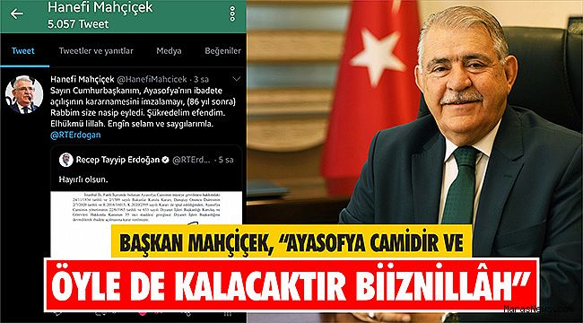 Mesajında Başkan Mahçiçek, “86 yıl sonra Ayasofya’nın