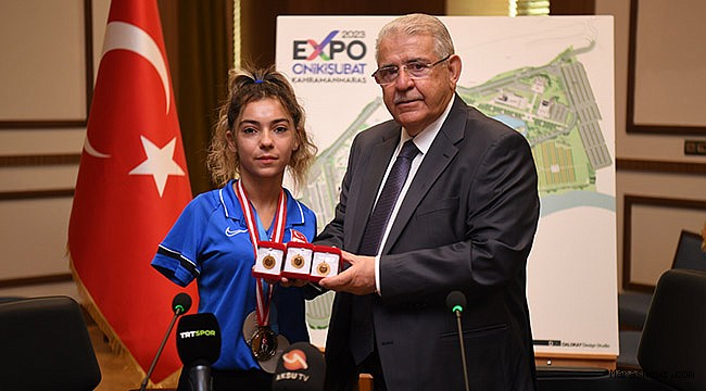 Başkan Mahçiçek, ziyaret sonrası Sevilay Öztürk’e 3 adet tam altın ile Onikişubat Belediyesi madalyası takdim etti.