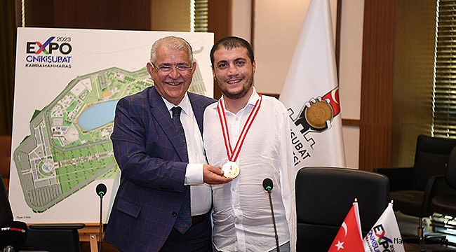 Başkan Mahçiçek, ziyaret sonrası Beytullah Eroğlu’na 3 adet tam altın ile Onikişubat Belediyesi madalyası takdim ederken, Beytullah ise ilk kez bir belediyeden madalya aldığını belirterek, en iyi şekilde saklayacağını ifade etti.