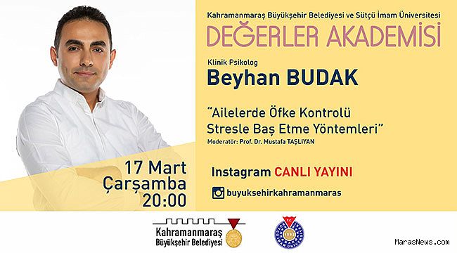 Kahramanmaraş Büyükşehir Belediyesi ve Kahramanmaraş Sütçü İmam Üniversitesi iş birliği ile gerçekleştirilen Değerler Akademisi etkinlikleri, 17 Mart Çarşamba günü (yarın) Beyhan Budak’ın konuk olacağı programla devam edecek. Saat 20.00’da, Büyükşehir Belediyesi instagram hesabından canlı yayınlanacak programda Klinik Psikolog Beyhan Budak, ‘Ailelerde Öfke Kontrolü Stresle Baş Etme Yöntemleri’ üzerine konuşacak. Prof. Dr. Mustafa Taşlıyan moderatörlüğünde gerçekleştirilecek programda, stres ve öfke kontrolü, ailede kriz yönetimi gibi pek çok konu masaya yatırılacak.