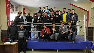 Kendi kilogramlarında derece elde eden boksörlerin madalyalarını Güreş Eğitim Merkezi Müdürü Ökkeş Solmaz, İl Boks Hakemleri ve Boks Antrenörü Ömer Köse.
