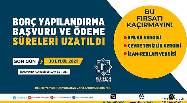 Açıklamanın devamında “Resmi Gazete'de yayımlanan Cumhurbaşkanı Kararı ile 7326 sayılı Bazı Alacakların Yeniden Yapılandırılması ile Bazı Kanunlarda Değişiklik Yapılmasına İlişkin Kanun hükümlerinden yararlanmak için öngörülen başvuru ve ilk taksit ödeme süreleri birer ay ötelendi. Belediyemize ait vergi, resim, harçlar ve belediye gelirleri kanununun 97. maddesine göre tahsil edilen (Gelir tarifesinde yazılı olan) ücretler, 30 Nisan 2021 tarihi ve öncesi borçlar yapılandırma kapsamına giriyor. Başvuruların; 30 Eylül 2021 tarihine kadar belediyemize şahsen veya https://ebelediye.elbistan.bel.tr adresine üye girişi yapılarak yapılması gerekmektedir. Peşin ödemelerde borçların gecikme ceza ve faizleri silinecek, bunun yerine Yİ-ÜFE aylık değişim oranları esas alınarak hesaplama yapılacaktır. Ayrıca 6, 9, 12 ve 18 taksitle borçlarınızı yapılandırabilirsiniz.