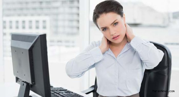 • Masabaşı işiniz varsa sık sık gerinin. Omuzlarınızı yukarı doğru kulak hizasına kadar yükselttikten sonra düşürebildiğiniz kadar düşürün. Bunu beş defa tekrar edin. Kürek kemiklerinizi birleştirin ve beş saniye süreyle öyle durduktan sonra gevşeyin. Yan boyun kaslarınızı esnetmek için oturur pozisyonda sol elinizle koltuğunuzun oturağına tutunarak güvde ve boynunuzu zıt tarafa doğru eğin. Ardından bu hareketi sağ elinizle tekrar edin.