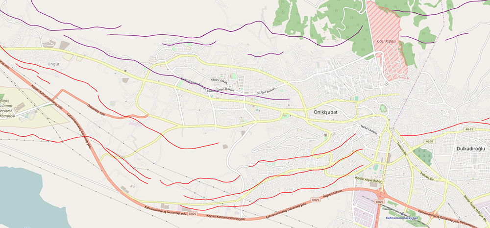 2011 yılında Maden Teknik Arama Enstitüsü Kahramanmaraş’ın diri fay haritasını güncelledi. Haritaya göre Kahramanmaraş’ın Şekerdere, Gayberli ve çevre yoluna yakın bölgeden paralel şekilde Üngüt istikametine giden 3 fay hattı çıktı. 3 fay hattından biri üzerindeki alanlar Kahramanmaraş Deprem Araştırma ve Risk Yönetim Merkezi Müdürü Yrd. Doç. Dr. Alican Kop’un yaptığı çalışma ile imara kapatıldı.