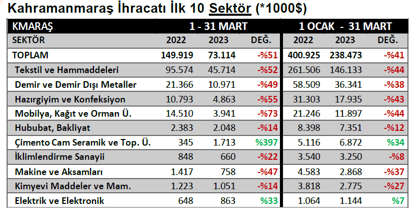 Mart ayında Kahramanmaraş’tan 78 bölgeye ihracat yapıldığını söyleyen Buluntu, konuşmasının devamında şunları kaydetti: “Şubat ayında Tekstil ve Hammaddeleri ihracatımız geçen yılın aynı ayına göre %52 azalarak 45.7 milyon dolar oldu. Demir ve demirdışı metaller (Metal Mutfak Eşyaları) ihracatımız geçen yılın aynı ayına göre %49 azalarak, 10.9 milyon dolara düştü. Mart ayında çimento ihracatımız geçen yılın aynı ayına göre %397 arttı. Kahramanmaraş’ın Mart ayında en çok ihracat gerçekleştirdiği ülkeler İtalya, Almanya, Bangladeş, Mısır oldu. Ocak-Mart döneminde en çok ihracat yapılan ilk 10 ülkeye ihracatta ortalama %18 düşüş yaşandı. Mart ayında Kahramanmaraş’tan 78 ülke/bölgeye ihracat yapıldı.