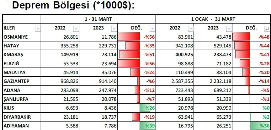 Deprem bölgesi ihracatında Mart ayı ortalama düşüş %18 oldu. Mart ayında Osmaniye, Elazığ ve Kahramanmaraş en yüksek oranda düşüş yaşayan iller oldular. Ocak-Mart döneminde en fazla düşüş yaşayan iller ise Osmaniye, Hatay ve Kahramanmaraş oldu. Ocak – Mart döneminde 11 il ihracatında önceki yılın aynı ayına göre yaklaşık 1 milyar dolarlık kayıp gerçekleşti.”