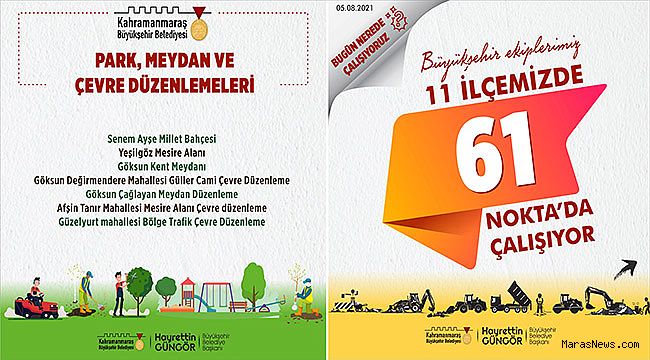 Kahramanmaraş Büyükşehir Belediyesi tüm ilçelerde yatırımlarını sürdürüyor. Fen İşleri Dairesi Başkanlığı koordinesinde 5 Ağustos Perşembe (bugün) tarihi itibariyle; 11 ilçenin tümünde çalışma gerçekleştirilirken, 61 ayrı konumda onlarca yatırım hayata geçiriliyor. Park, meydan ve çevre düzenlemelerinden, yeni hizmet tesislerinin inşa edildiği yapı inşaat çalışmalarına, yol bakım ve onarım uygulamalarından, köprü yapımlarına kadar birçok kapsamda yürütülen çalışma noktalarına ise https://kahramanmaras.bel.tr/duyuru/2021/05/24/fen-isleri-dairesi-baskanligi-gunluk-calisma-programi adresi üzerinden ulaşılabiliyor.